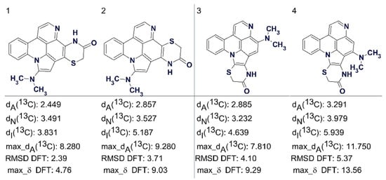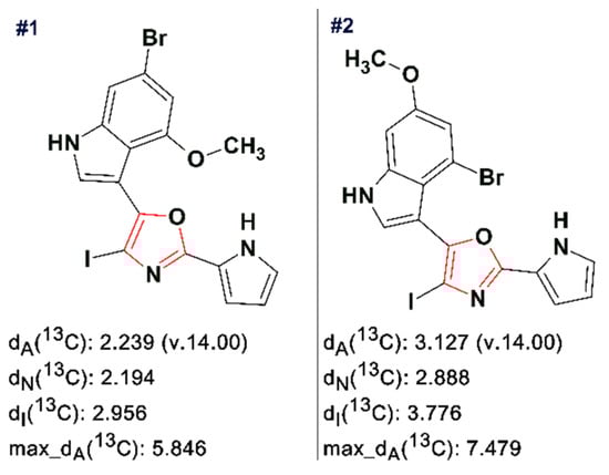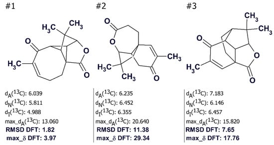 When the 13C chemical shifts of the three structures were calculated using the DFT approach the priority of the structure #1 was reliably confirmed by the values of RMSD and the max_δ calculated by the QM method (see Figure 21).