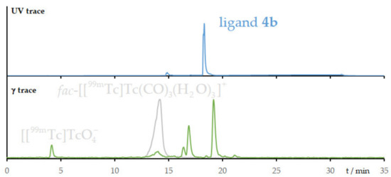 (Radio) HPLC chromatograms of ligand 4b (blue, tR = 15.2 min), the 99mTc-tricarbonyl precursor (gray, tR = 14.1 min), and the reaction mixture after radiolabeling (green).