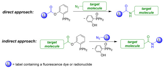 The traceless Staudinger ligation belongs to the biorthogonal click conjugation reactions and is widely used, e.g., to connect small molecules to (bio)macromolecules like peptides, proteins, or carbohydrates, for cyclization processes to construct large sized lactams, or for the preparation of molecular rods [1,2,3,4,5]. In general, two variants of the traceless Staudinger ligation are described for (radio)labeling purposes [6,7]. Both approaches are shown in Scheme 1. The direct variant is based on a modified phosphane containing the (radio)label, which is reacted with an azide-containing biomolecule. The second, indirect variant, uses an azide-functionalized molecule bearing the (radio)label and a biomolecule, which is connected to the phosphane unit. Due to the smooth reaction conditions, the insertion of any label, such as fluorescent dyes [8] or radionuclides like fluorine-18 [9], iodine-131, or radiometals [7], is also possible without the need for a catalyst in contrast to other Cu-catalyzed click reactions.