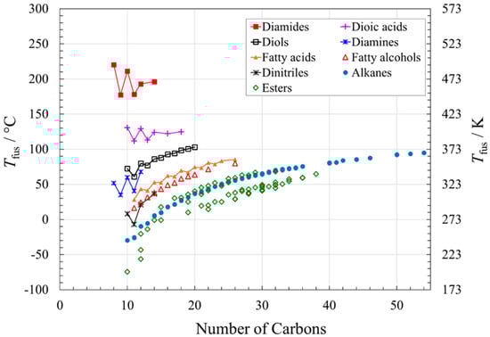 The following supporting information can be downloaded at: https://www.mdpi.com/article/10.3390/molecules26216635/s1. Table S1: Melting points of alkanes with 10 to 55 carbons (data for Figure 1 and Figure 2); Table S2: Thermal properties of alkanes with odd numbers of carbons from 11 to 35 (data for Figure 2 and Figure 5); Table S3: Thermal properties of alkanes with even numbers of carbons from 10 to 46 (data for Figure 2 and Figure 5); Table S4: Melting points and enthalpies of fusion of fatty alcohols with 13 to 26 carbons (data for Figure 1 and Figure 6); Table S5: Melting points and total enthalpies of transition of fatty alcohols with 12 to 26 carbons (data for Figure 6); Table S6: Melting points and enthalpies of fusion of fatty acids with 11 to 26 carbons (data for Figure 1 and Figure 7); Table S7: Melting points and enthalpies of fusion for esters with 10 to 38 carbons (data used for Figure 1, Figure 3 and Figure 8); Table S8: Melting points and enthalpies of fusion of diamides with 8 to 14 carbons (data for Figure 1 and Figure 7); Table S9: Melting points and enthalpies of fusion of diamines with 8 to 12 carbons (data for Figure 1 and Figure 9); Table S10: Melting points and enthalpies of fusion for dinitriles with 10 to 14 carbons (data for Figure 1 and Figure 9); Table S11: Melting points and enthalpies of fusion for diols with 10 to 20 carbons (data for Figure 1 and Figure 9); Table S12: Melting points and enthalpies of fusion of dioic acids with 10 to 18 carbons (data for Figure 1 and Figure 9). All Tables include their literature references.