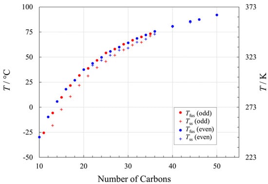 For the alkanes (paraffins), close examination of the melting points as a function of chain length (Figure 2) reveals two nearly parallel trends for n < 20, one for the even numbers of carbons, and one for the odd chain lengths [19,26,27]. These separate trends arise from their two distinct packing arrangements [85,86], with even-carbon chains packing more efficiently and therefore having higher melting points [16]. For 20 < n < 44, the even-carbon alkane series also has one or more solid–solid transitions before the melting point [26,87,88]. Similarly, solid–solid transition(s) occur in the odd-carbon alkanes for 11 > n > 41 [26,87,88]. The solid–solid transitions pre-empt some of the enthalpy change that otherwise would be used for ΔfusH, as discussed below.