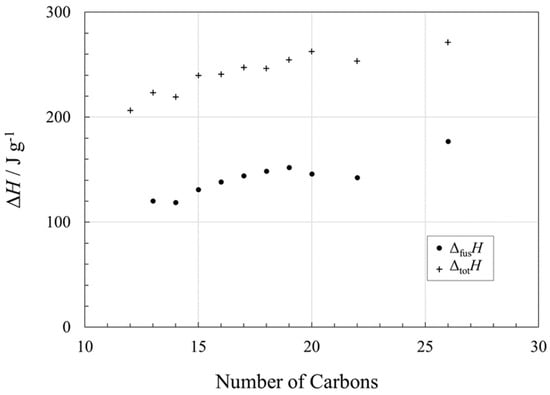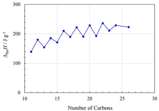 Alkanes (paraffins) are among the most prominent PCMs used commercially, in applications including residential solar thermal systems and passive thermal management systems. From Figure 5, it is apparent that the values of ΔfusH are favorable for thermal energy storage (>100 J g−1) and that the odd–even chain length effect observed in the alkane melting points (Figure 2) is even more prominent in ΔfusH.