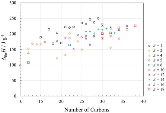 The gravimetric enthalpies of fusion show a general trend to higher values as the number of carbons in the molecular structure increases. Within a given alkyl chain length (A), there are discernible odd–even effects (especially apparent for methyl esters, A = 1), with the odd values giving lower values of ΔfusH. This trend also was observed for alkanes (Figure 5) and fatty acids (Figure 7) and again can be associated with different packing regimes for odd and even chain lengths [17], although the ester melting points (Figure 3) do not show very large odd–even effects. For a given number of carbons in the ester backbone, the general trend is to higher values of ΔfusH with shorter alkyl chains (smaller A values), but these trends are not always followed (e.g., for n = 22, the order of decreasing ΔfusH is A = 1, 2, 10, 6). With the wide ΔfusH range of isomeric esters, i.e., esters with the same total number of carbons, it is difficult to make comparisons of enthalpies of fusion with alkanes, alcohols and fatty acids at the same overall chain length, or at a given melting point. However, the values of ΔfusH for the vast majority of the esters examined are >150 J g−1, which is very favorable for their use as phase change materials.