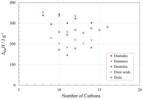 Most remarkable are the high gravimetric ΔfusH values of the diamines and diamides, especially with even numbers of carbons, even exceeding the value for water (334 J g−1) in the cases of octane−1,8-diamine at 353 J g−1 [82] and suberamide (n = 8) at 339 J g−1 [18]. The relatively strong hydrogen bonding at both ends of these molecules and flexibility of the alkyl chains contribute to these exceptionally high values of ΔfusH. A thorough study of diamides showed that only some short-chain compounds decompose on melting [18]. Within the α,ω-disubstituted alkane compounds considered here, dinitriles have the lowest values of gravimetric ΔfusH, reflecting their low contribution from hydrogen bonding.