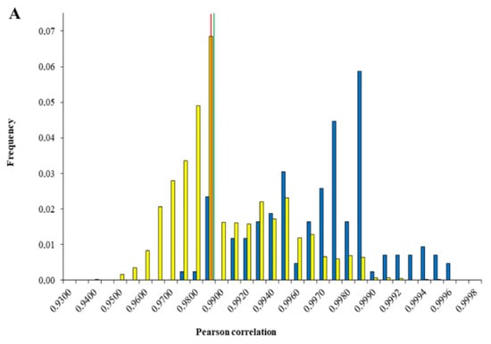 Histograms of the Pearson correlation coefficients and their respective distribution overlap for (A) the reference data (GC–FID-aligned data) and (B) after fourth root normalization. The yellow bar chart corresponds to the coefficients of the inter-location samples, while the blue bar chart refers to the intra-location correlation coefficients. The two confidence limits are represented as the green vertical line for the 95% CL and the red vertical line for the 99% CL.