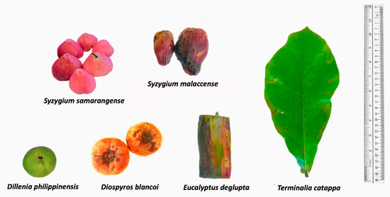 Fruits of S. malaccense and D. discolor as well as bark of E. deglupta were collected from the municipality of Naga, Zamboanga Sibugay. Meanwhile, fruit peels of D. philippinensis, and S. samarangense, and leaf of T. catappa were sampled inside the UP Diliman Campus. Specimens were identified at the Jose Vera Santos Memorial Herbarium, Institute of Biology, UP Diliman.