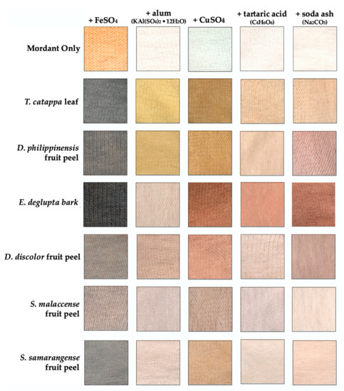 Color palette from the biowaste dyes applied in cotton using different mordants. Comparison of color is through the measured hue (color component), value (lightness), and saturation (intensity). Lighter color (low %V value) is obtained in the presence of FeSO4, especially for E. deglupta and T. catappa (both black). D. philippinensis extract mordanted with alum also produced yellow comparable to the well-studied T. catappa. Interestingly, red-brown coloration was uniquely observed in E. deglupta with CuSO4 or alkali.