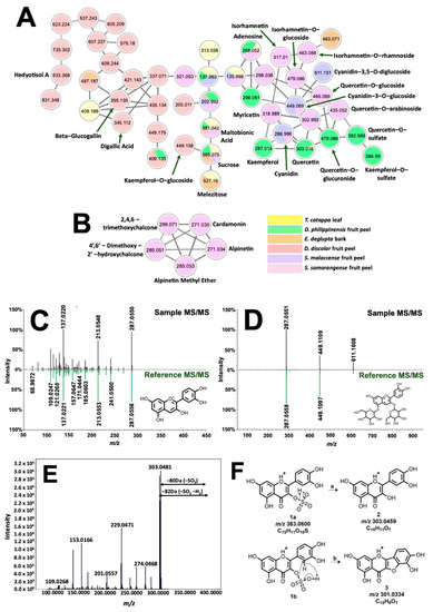 Molecular networking and identification of phenolic compounds from the extracted biocolorants. Structural relationship of flavonoids, sugars, and glycosylated and galloylated compounds are shown in (A). Different fragmentation schemes for chalcones in S. samarangense led to their exclusive clustering in (B). Tail-to-tail alignments for cyanidin and cyanidin-3,5-O-diglucoside are presented in (C) and (D), respectively. Meanwhile, MS/MS spectra associated with quercetin-3-O-sulfate are presented in (E). Fragmentation analysis (F) suggested sulfate substitution on the hydroxyl at C-3 of quercetin.