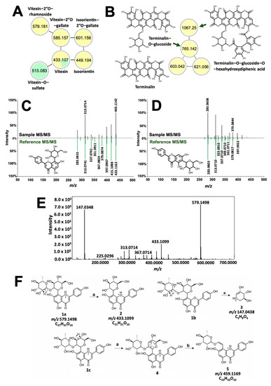 Compounds with high molecular weight showed distinct clusters with molecular networking. Spectral families in Figure 6C,D include precursor ions common between T. catappa and D. philippinensis, which can be implicated in the comparable color profiles resulting from the two samples. GNPS annotated vitexin (Figure 6C) in D. philippinensis, whereas isovitexin (Figure 6D) gave high signal intensity in T. catappa. These isomers yielded identical product ions characteristic of C-glycosylated flavonoids [33]. Vitexin is differentiated by a high intensity of dehydration reaction products from C-8 glycosylated flavonoids [33,34]. Cross-ring cleavage of the pyran ring, on the other hand, is favored for C-6 glycosylated flavonoids as can be seen for isovitexin (Figure 6D) [33,34]. This difference in product ion intensities was used to characterize the glycosylation sites on the other analogs (Figure 6A). Unmatched precursor ions with m/z 579.1496 displayed a similar fragmentation pattern as vitexin (Figure 6E). Neutral loss of 146 Da and the presence of m/z 147.0436 were linked to the presence of a rhamnose group (Figure 6F) [29]. The location of this modification was also identified to be C-2 of the pyran ring, based on one of the cross-ring cleavage products with m/z 459.1169 (Figure 6F) [33]. Hence, the annotation given to m/z 579.1496 is vitexin-2”O-rhamnoside (1.55 ppm). A similar approach was used to characterize m/z 585.1265 and m/z 601.1261, which resembles the fragmentation pattern of vitexin and isoorientin, respectively. Again, neutral loss of 152 Da, and intense m/z 153.0192 product ion resulted in the annotation of the precursor ions as vitexin-2”O-gallate (m/z 585.1265, 3.59 ppm) and isoorientin-2”O-gallate (m/z 601.1261, 3.66 ppm). Vitexin-O-sulfate was also characterized based on its network connection with vitexin, and neutral loss of 80 Da. Position of the sulfate group cannot be determined due to the absence of diagnostic productions.