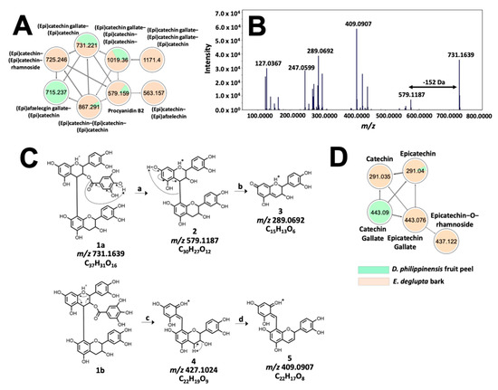 Molecular networking and fragmentation analysis of proanthocyanidins common to D. philippinensis and E. deglupta. Clustering of complex tannins is shown in (A); tandem MS spectrum of m/z 731.1667 is presented in (B) and served as the basis for fragmentation analysis that characterized the precursor ion as epicatechin-O-gallate-epicatechin (C). On the other hand, a smaller network of flavan-3-ol and their galloylated and glucosylated analogs is described in (D).