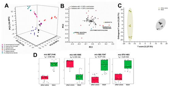 Comparative statistical analyses of metabolite profiles of plant biowaste sources. Unsupervised principal component analysis (PCA) (A) with its log-transformed loadings plot (B) and supervised OPLS-DA (C) show distinct separation between samples according to metabolite constituents and their produced color upon reaction with FeSO4 mordant. Putatively identified flavonoids (colored data points) were among the heavily contributing features (B) to the dispersion of samples in the PCA scores plot. Samples that produce the black color such as extracts from E. deglupta bark, D. philippinensis peel, and T. catappa leaves show the upregulation of some polyphenols (D) such as m/z 867.2146 (epicatechin), m/z 579.1483 (procyanidin B2), and m/z 585.1257 (vitexin-2”-O-gallate).