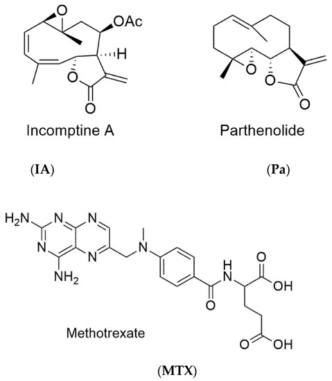 Structures of incomptine A (IA), parthenolide (Pa), and methotrexate (MTX).