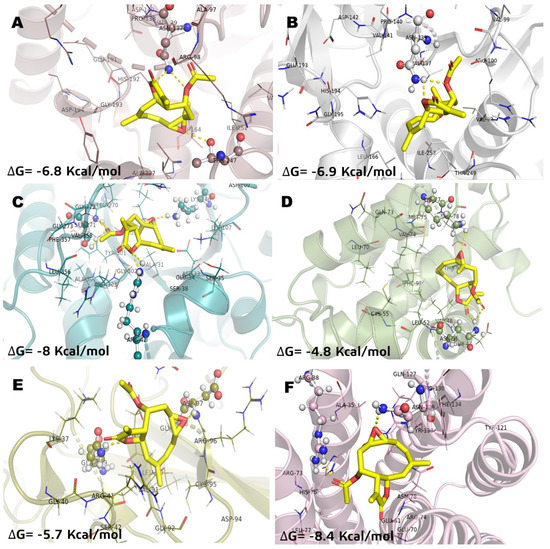 Molecular model of the virtual screening for incomptine A (IA) bound to (A) L-lactate dehydrogease A chain (LHDA); (B) L-lactate dehydrogenase B chain (LDHB); (C) Fructose-bisphosphate aldolase (ALDOA); (D) Bcl-2-regulator protein A1 (BCL-2A1), (E) NF-kappa B p65 (RelA) homodimer (NFkB); and (F) Microsomal glutathione S-transferase 1 (MGST1); ΔG = binding energy.