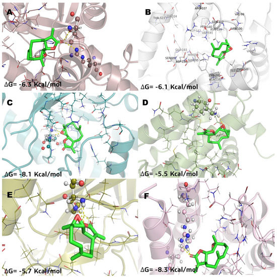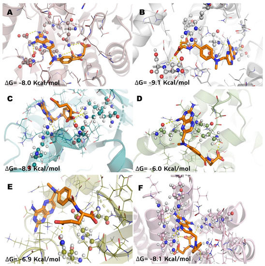 Molecular model of virtual screening for methotrexate (MTX) bound to (A) L-lactate dehydrogease A chain (LHDA), (B) L-lactate dehydrogenase B chain (LDHB), (C) Fructose-bisphosphate aldolase (ALDOA), (D) Bcl-2-regulator protein A1 (BCL-2A1), (E) NF-kappa B p65 (RelA) homodimer (NFkB), and (F) Microsomal glutathione S-transferase 1 (MGST1); ΔG = binding energy.