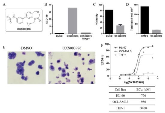 Profile of the confirmed hit OXS003976: (A) chemical structure of OXS003976; (B) OXS300976 (10 µM) upregulates CD11b expression but not of the isotype antibody after a 4-day treatment of HL-60 cells; (C) OXS003976 (10 µM) decreases viability and (D) total number of HL-60 cells after a 4-day treatment; (E) OXS003976 (10 µM) induces changes in the morphology of HL-60 cells after a 4-day treatment; (F) a resynthesised sample OXS003976 increases CD11b expression of HL-60, OCI-AML3 and THP-1 cells in a dose-dependent manner after a 4-day treatment.