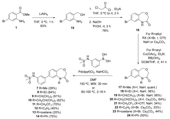 To facilitate the synthesis of these analogues, the route used for OXS003976 was modified to enable introduction of the N-substituents at a later stage (Scheme 2). Specifically, the dihydrobenzoxazepinone core was first cyclised to 16, which was further derivatised via nucleophilic substitution. The exception was N-phenyl analogue 14, in which the aromatic group was introduced through Chan-Lam coupling. Better yields for the final Suzuki reaction were obtained when performed after N-substitution.