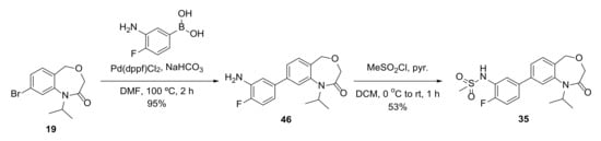 4.14.38. N-(2-Fluoro-5-(1-isopropyl-2-oxo-1,2,3,5-tetrahydrobenzo[e][1,4]oxazepin-8-yl)phenyl)methanesulfonamide (35)