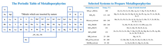 Periodic table of metalloporphyrins and metalating systems to prepare metalloporphyrins adapted from “The Porphyrins” Structure and Synthesis, PART A, Ed. D. Dolphin, Academic Press, New York, San Francisco, London 1978.