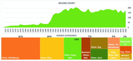 Results of the search in the Web of Science using metalloporphyrin as keyword in “all fields” (September 2021) presented as record count since 1972 and distribution by science categories (considering only the ones with more than 150 records).