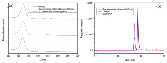 The same reaction conditions were tested for the preparation of the copper (II) complex. After 30 min under ultrasound the free porphyrin was not observable by UV-Vis (Figure 4a). However, the HPLC analysis of the reaction crude shows the presence of 21% of free porphyrin (Figure 4b). After exclusion chromatography purification, 53% yield of copper complex was obtained (entry 2, Table 3). The above described reaction conditions were applied for the complexation of 200 mg of 5,10,15,20-tetrakis-N-methyl-4-pyridylporphyrin in 1 mL of water with Zn(OAc)2·2H2O and Cu(OAc)2·H2O yielding 57% and 37% of the corresponding metal complexes.