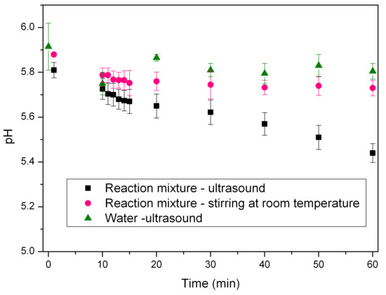 pH of the metalation reaction (TMePyP and 1 equivalent of Cu(OAc)2·H2O in 1 mL of water) vs. time under ultrasound (5 independent experiments, black) and under stirring at room temperature (2 independent experiments, pink), pH of water under ultrasound (2 independent experiments green).