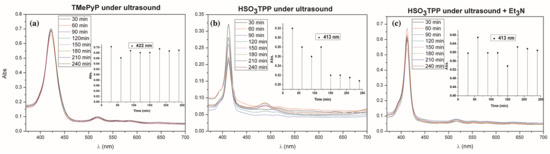 UV-Vis spectra of (a) TMePyP and (b) 4-SO3HTPP in water under ultrasound irradiation for 240 min. (c) UV-Vis spectra of 4-SO3HTPP in water under ultrasound irradiation for 240 min measured after the addition of 1 drop of Et3N. Inset: Absorption at the Soret band maximum vs. time.
