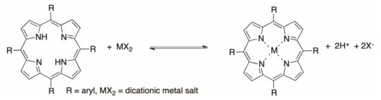 - Atoyebi, A.O.; Brückner, C. Observations on the Mechanochemical Insertion of Zinc(II), Copper(II), Magnesium(II), and Select Other Metal(II) Ions into Porphyrins. Inorg. Chem. 2019, 58, 9631–9642. [Google Scholar] [CrossRef]