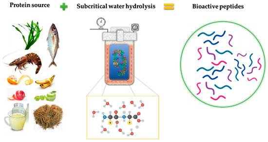 For a long time, the application of SW in proteins has focused mainly on obtaining amino acids but not on their intermediates, the peptides. However, in recent years, research has focused on peptide release as an alternative method to enzymatic hydrolysis. In this sense, the main objective of the present paper was to provide a review of the use of subcritical water hydrolysis (SWH) as a powerful tool for obtaining bioactive peptides (Figure 1).