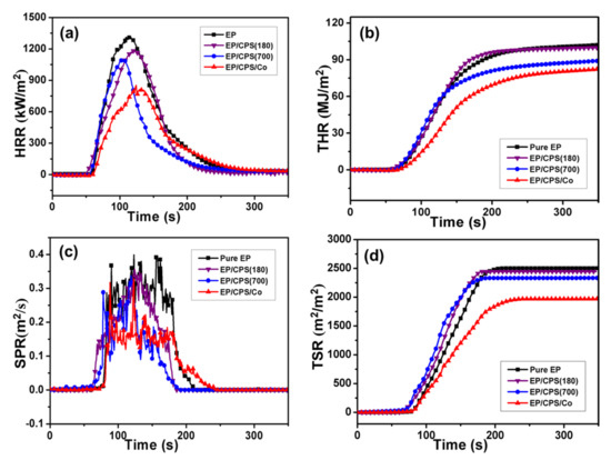 The introduction of all FRs additives brought no obvious changes for the time to ignition (TTI). The HRR and THR curves of EP and its composites are shown in Figure 5a,b. Neat EP burns rapidly with high pHRR and THR, with a value of 1313 kw/m2 and 101 MJ/m2, respectively. Although the loading of CPS (180) does not deliver any significant improvement, the flame retardancy of EP has been improved by adding CPS (700) and CPS/Co. Specifically, compared with neat EP, the pHRR of EP/CPS (700) decreased by 17.4%, from 1313 kw/m2 to 1084 kw/m2. The value of THR was also reduced by 12.6%, from 102 MJ/m2 to 89 MJ/m2. Meanwhile, the pHRR of EP/CPS/Co dropped by 37.9%, from 1313 kw/m2 to 816 kw/m2. Additionally, the THR value decreased by 19.3%, from 102 MJ/m2 to 82 MJ/m2. Therefore, the addition of CPS/Co leads to the most efficient reduction of pHRR and THR. Similarly, the lowest value of MARHE (maximum average rate of heat emission), which represents the mean HRR curve to some extent, was noted for EP/CPS/Co (426.0 kw/m2).