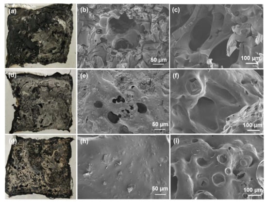 Digital photos of residues and SEM images of interior and exterior char residue for: (a–c) EP, (d–f) EP/CPS (700) and (g–i) EP/CPS/Co.