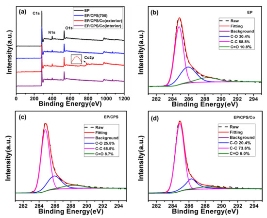 Figure 7b–d present the high resolution of C1s XPS spectra of interior char. The characteristic C1s bands at 284.8 ev, 286.2 ev, 288.4 ev can be attributed to the C-H/C-C (aliphatic and aromatic species), C-O (hydroxy group and/or ether) and C=O, respectively [43]. In terms of the interior char’s aliphatic and aromatic species concentration, the relationship between EP composites is EP/CPS/Co > EP/CPS (700) > pure EP. This indicates that the char of EP/CPS/Co has the highest graphitisation degree among the samples [44]. The values of Cox/Ca (Cox denotes oxidised carbon, Ca denotes aliphatic and aromatic carbons) are calculated to compare the thermal-oxidative resistance of the matrix. The Cox/Ca values of EP/CPS/Co and EP/CPS are 0.36 and 0.53, respectively, which are much lower than pristine EP (0.7).
