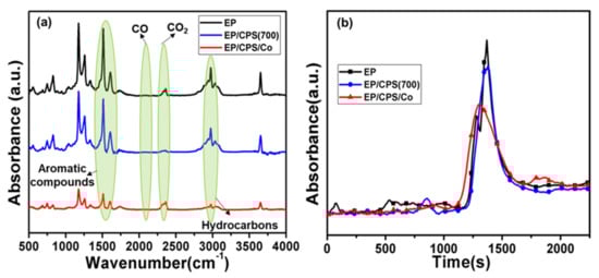 To further explore the flame retardancy mechanisms, the gaseous phase was investigated by TG-FTIR, which is a semi quantitative analysis. The FTIR spectra of pyrolysis products of pure EP, EP/CPS (700) and EP/CPS/Co are revealed in Figure 8a. The intensity of absorbance is a relative value, and all the samples from the same batch were compared with pure EP. Some evolved gases are identified by the characteristic, unambiguous FTIR signals, including aromatic compounds (1407, 1510, 1607 cm−1), CO (2190 cm−1), CO2 (2360 cm−1), C-H groups for acetone, ethers, allyl alcohol and different kinds of hydrocarbons (2800–3100 cm−1) [45,46]. The Gram-Schmidt curves of EP and its composites are shown in Figure 8b. It shows that the absorbance of pyrolysis products from EP/CPS/Co is much lower than pristine EP, followed by EP/CPS (700).