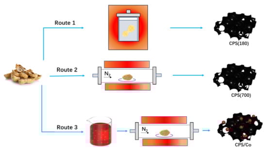 In this paper, peanut skin was carbonised as the only raw material at different temperatures in the first two methods. On the other hand, considering the catalysis effect of transition metal [25,26,27], Cobalt [28,29] was chosen to combine with carbonised peanut shells to improve the charring formation in the third method. The main objectives of the reported work herein are summarised as follows: