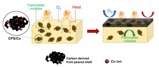 Biomass-derived carbon has been recognised as a green, economic and promising flame retardant (FR) for polymer matrix. In this paper, it is considered that the two-dimensional (2D) structure of carbonised peanut shells (PS) can lead to a physical barrier effect on polymers. The carbonised sample was prepared by the three facile methods, and firstly adopted as flame retardants for epoxy resin. The results of thermal gravimetric analysis (TGA) and cone calorimeter tests indicate that the carbon combined with nano Cobalt provides the most outstanding thermal stability in the current study. With 3 wt.% addition of the FR, both peak heat release rate (pHRR) and peak smoke production rate (PSPR) decrease by 37.9% and 33.3%, correspondingly. The flame retardancy mechanisms of the FR are further explored by XPS and TG-FTIR. The effectiveness of carbonised PS can be mainly attributed to the physical barrier effect derived by PS’s 2D structure and the catalysis effect from Cobalt, which contribute to form a dense char layer.