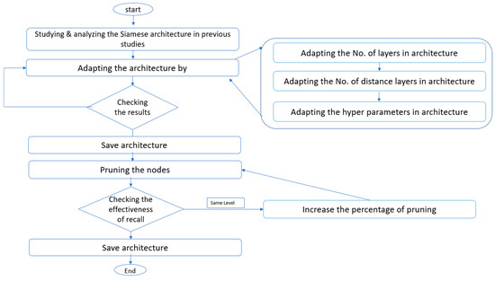 A Siamese neural network includes two artificial neural networks that are the same, each able to handle the hidden input data representation, which have to be linked to a final layer using a distance layer to predict whether or not two vectors fall under the same group. The networks that make up the Siamese architecture are called twins since all the weights and biases are connected. This means that both networks are symmetric. During training, the two neural networks use both feedforward perceptron and error back-propagation. As a result, it has been applied to more complex data samples, particularly heterogeneous data samples with varying dimensionality and type properties [13]. In this paper, the Siamese multilayer perceptron (MLP) model will be enhanced; the flowchart of steps for enhancing the Siamese architecture is presented in Figure 1: