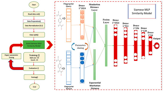 A fusion layer was then added between two distance layers—Manhattan and Exponential Manhattan—and was the reason for using more than one similarity distance to enhance the measures of similarity between molecules. The ReLU activation function has been used for all layers except the last one, in which the sigmoid activation function has been used. Moreover, the RMSprop optimizer has been used and the loss function was (binary_crossentropy); and the batch size was 256. Figure 2 demonstrates the architecture of the enhanced Siamese MLP similarity model.