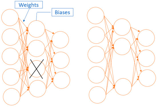 As deep neural networks contain more layers, we must multiply multiple floating-point integers together, which takes a long time to train and infer and consumes a lot of computing resources. The problem mentioned above can be solved in a number of ways, including weight sharing, pruning, quantization, and so on. The goal of model pruning is to reduce the number of parameters while maintaining model correctness, which entails pruning parts of the network that give little or no information to the network during inference. As a result, models are smaller in size, and more memory-efficient, power-efficient, and faster at inference with low accuracy loss [16,39]. Weight pruning and node pruning are the two most common methods of pruning. In weight pruning, individual weights are ranked in a weight matrix W based on their magnitude (or any other criterion), and the smallest k percent of the weights are set to zero in weight trimming. This corresponds to deleting connections between nodes in different layers. However, in node pruning, the columns that represented nodes in weight matrix are set to zero, in effect deleting the corresponding output neuron. Here, nodes are ranked according to their magnitude (or any other criterion), and the smallest k percent of each node is set to zero. Pruning nodes will be employed in this research. Figure 3 demonstrates the idea of node pruning.