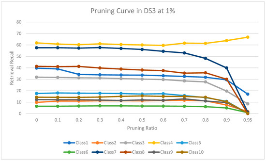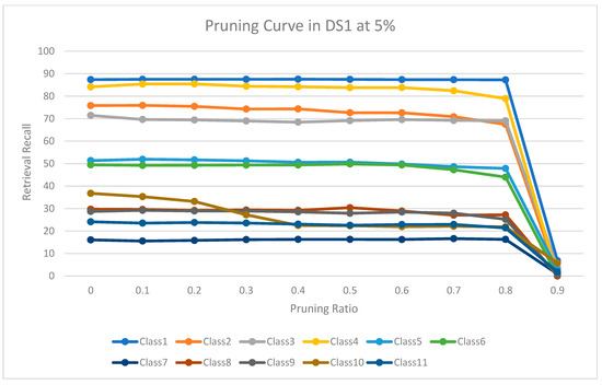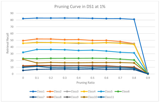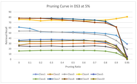 Figure 4 shows the level of the retrieval recall values at different pruning ratios for each class at the top 1% in DS1. We note that the recall values of most classes remain the same until they reach 80% of the pruning ratio, while some classes increased slightly, such as class 7, and decreased by a little in others, such as classes 2 and 9. Furthermore, Figure 5 shows the level of retrieval recall values at different pruning ratios for each class at the top 5% in DS1. The recall values of most classes remain the same values until they reach 80% of the pruning ratio, while some classes decreased, such as classes 2 and 10.