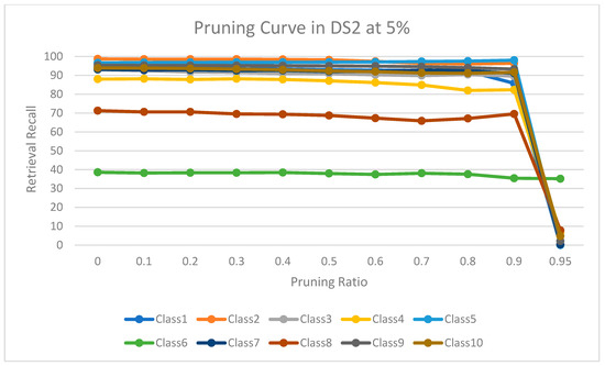 Figure 6 shows the level of retrieval recall values at different pruning ratios for each class at the top 1% in DS2. We note that the recall values of most classes remain the same until they reach 90% of the pruning ratio, while some classes increased slightly, such as classes 5 and 8, and decreased by a little in others, such as classes 1, 3, and 4. Furthermore, Figure 7 shows the level of retrieval recall values at different pruning ratios for each class at the top 5% in DS2. The recall values of most classes remain the same until they reach 90% of the pruning ratio, except for class 6, which remains until more than 95% of the pruning ratio, while some classes decreased by a little, such as class 4, or increased slightly, such as class 5.