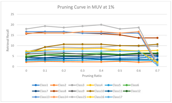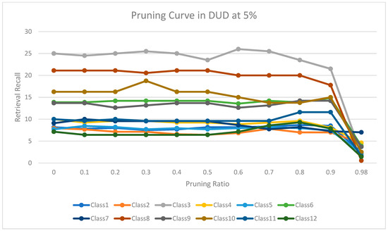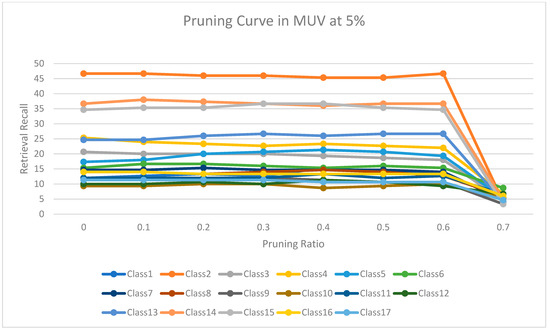 Figure 10 shows the level of retrieval recall values at different pruning ratios for each class at the top 1% in MUV. We note that the recall values of most classes remained the same until they reached 60% of the pruning ratio, while some classes increased slightly, such as classes 3 and 10, and decreased by a little in others, such as class 8. Moreover, Figure 11 shows the retrieval recall values at different pruning ratios for each class at the top 5% in MUV. The recall values of most classes remained the same until they reached 60% of the pruning ratio, while some classes increased slightly, such as classes 1, 3 and 5, and decreased by a little in others, such as classes 3 and 4.