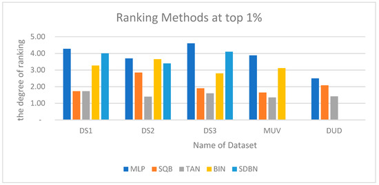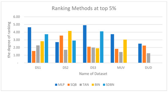 Moreover, the Kendall W concordance test has been used; Table 16 shows the ranking of the enhanced Siamese multilayer perceptron method based on previous studies of TAN, BIN, SQB, and SDBN using Kendall W test results for MDDR-DS1, MDDR-DS2, MDDR-DS3, MUV, and DUD at the top 1% and 5%. The first method is the benchmark method, which is the Tanimoto coefficient TAN; the second method is Bayesian inference [24]; the third method is quantum similarity search SQB-Complex [28]; the last method is multi-descriptor-based on Stack of deep belief networks SDBN [31]. The results of the Kendall W test of the top 1% for all used datasets show that the values of associated probability (p) are less than 0.05. This indicates that the enhanced Siamese multilayer perceptron method is significant in the top 1% for all cases. As a result, the overall ranking of all methods indicates that the enhanced Siamese multilayer perceptron method is superior to previous studies and benchmark TAN. The overall ranking for methods showed that MLP has the top ranks among other methods. This is the same as with the results of the Kendall W test of the top 5%; the results show that the values of associated probability (p) are less than 0.05. This indicates that the enhanced Siamese multilayer perceptron method is significant in the top 5%. As a result, the overall ranking of all methods indicates that the enhanced Siamese multilayer perceptron method is superior to previous studies for all datasets and the overall ranking for the method showed that Siamese multilayer perceptron method has the top ranks among other methods, except in DR2, in which the BIN method was better than MLP. Figure 14 and Figure 15 show the ranking of the enhanced Siamese multilayer perceptron method based on TAN, BIN, SQB, and SDBN using the Kendall W test results for DS1, DS2,DS3, MUV, and DUD at the top 1% and 5%.