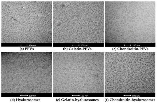 Figure 1. Representative cryo-TEM images of vesicles: (a) PEVs; (b) gelatin-PEVs; (c) chondroitin-PEVs; (d) hyalurosomes; (e) gelatin-hyalurosomes; (f) chondroitin-hyalurosomes.