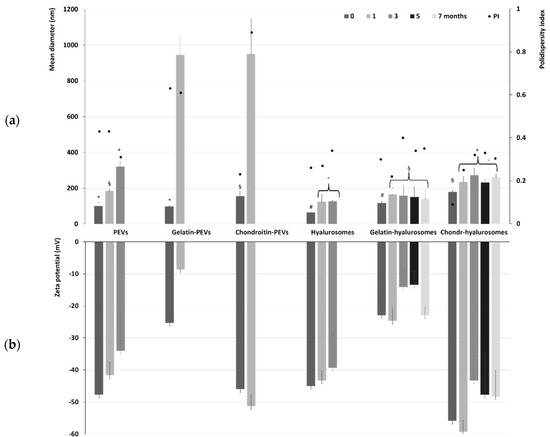 Figure 2. (a) Mean diameter, polydispersity index (PI) and (b) zeta potential of the extract-loaded PEVs, gelatin-PEVs, chondroitin-PEVs, hyalurosomes, gelatin-hyalurosomes, chondroitin-hyalurosomes, measured over seven months. Data represent the means ± standard deviations of at least six replicates. The same symbol (*, §, +, #, °) indicates the same value.