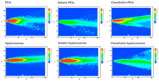 The cone generated by PEVs, chondroitin-PEVs, hyalurosomes and gelatin-hyalurosomes had a central part intensely colored in red, indicating high velocity (Figure 4). Indeed, the maximum speed values for PEVs and chondroitin-PEVs were ~13.4 m/s, and those of hyalurosomes and gelatin-hyalurosomes were ~15.1 m/s, thus quite similar in structure and values to those obtained using the water [44]. The maximum velocity of gelatin-PEVs and chondroitin-hyalurosomes was the lowest (~7.7 m/s), as they did not generate a red cone core.