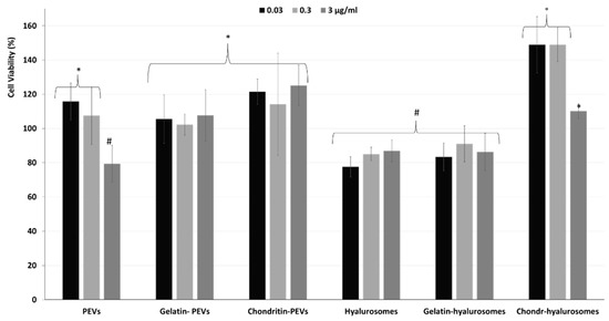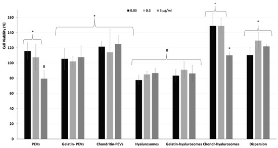 Figure 5. Viability of keratinocytes treated with C. halicacabum extract in dispersion or loaded in PEVs; gelatin-PEVs; chondroitin-PEVs; hyalurosomes; gelatin-hyalurosomes; and chondroitin-hyalurosomes, at different dilutions (extract 0.03, 0.3, 3 µg/mL). Data represent the means ± standard deviations of at least three experimental determinations. Each symbol (*, #, °) indicates the same value.