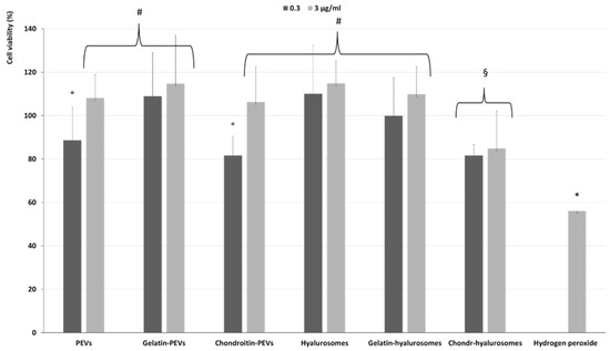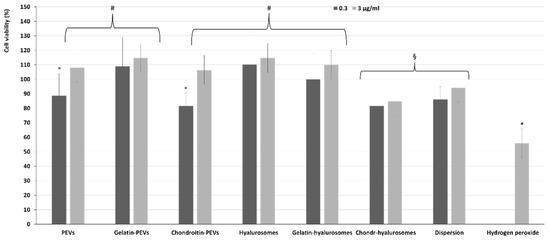 Figure 6. Viability of keratinocytes stressed with hydrogen peroxide and treated with C. halicacabum extract-loaded PEVs; gelatin-PEVs; chondroitin-PEVs; hyalurosomes; gelatin-hyalurosomes; chondroitin-hyalurosomes, at different dilutions (extract 0.3, 3 µg/mL). Data represent the means ± standard deviations of cell viability expressed as the percentage of the negative control (100%). Each symbol (*, #, °, §) indicates the same value.