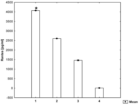 Concentrations of RANTES in the cell culture supernatant (ANOVA). 1—cell suspension + mitogen + homocysteine, 2—cell suspension + mitogen, 3—cell suspension, 4—medium. * statistically significant difference compared to every other group for p ≤ 0.05.