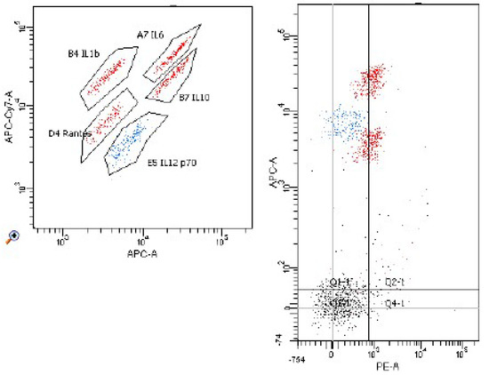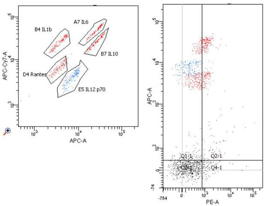 Il-1β, Il-6, Il-12, Il-10 and RANTES expression in cell suspension with mitogen (Flow Cytometry raw data for a single patient).