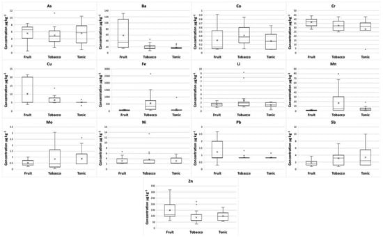 | Elements | All Flavors (n = 37) (Mean; Range; % Samples > LoQ) | Fruity Flavors (n = 9) (Mean; Range; % Samples > LoQ) | Tobacco Flavors (n = 16) (Mean; Range; % Samples > LoQ) | Tonic Flavors (n = 12) (Mean; Range; % Samples > LoQ) | ||||