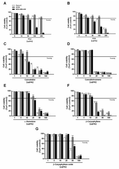 In order to evaluate the possible bioactive compounds of FOJ and FOS, the cytotoxicity of the major nonintoxicating phytocannabinoids (i.e., cannabidiol and cannabichromene) and caryophyllane sesquiterpenes (i.e., α-humulene, β-caryophyllene, and β-caryophyllene oxide), as revealed at GC-MS analysis, was studied.